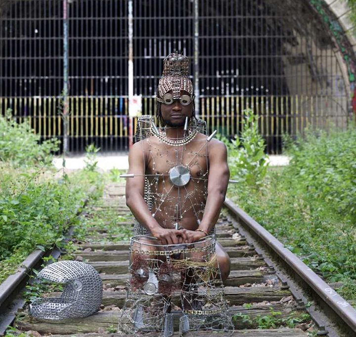 Avec la précision d’un orfèvre et la grâce d’un couturier, il transforme le fil de métal en sculptures habitées, costumes-masques et installations puissantes.