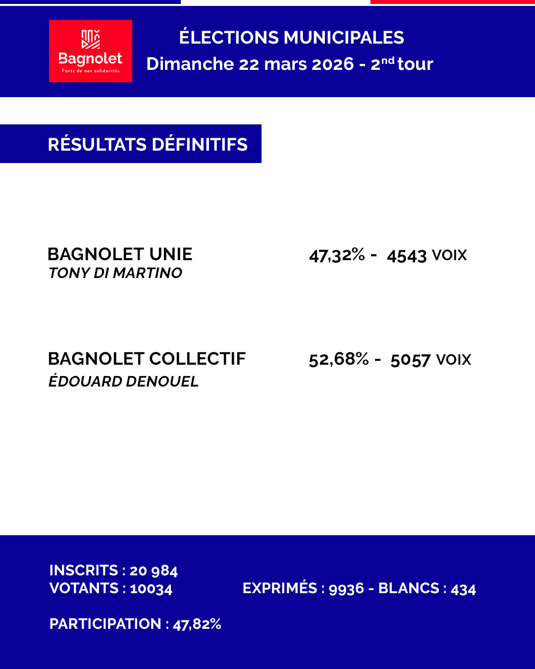 Retrouvez ci-dessous, à l'issue du second tour des élections municipales de ce dimanche 22 mars 2026, les résultats définitifs pour la Ville de Bagnolet.